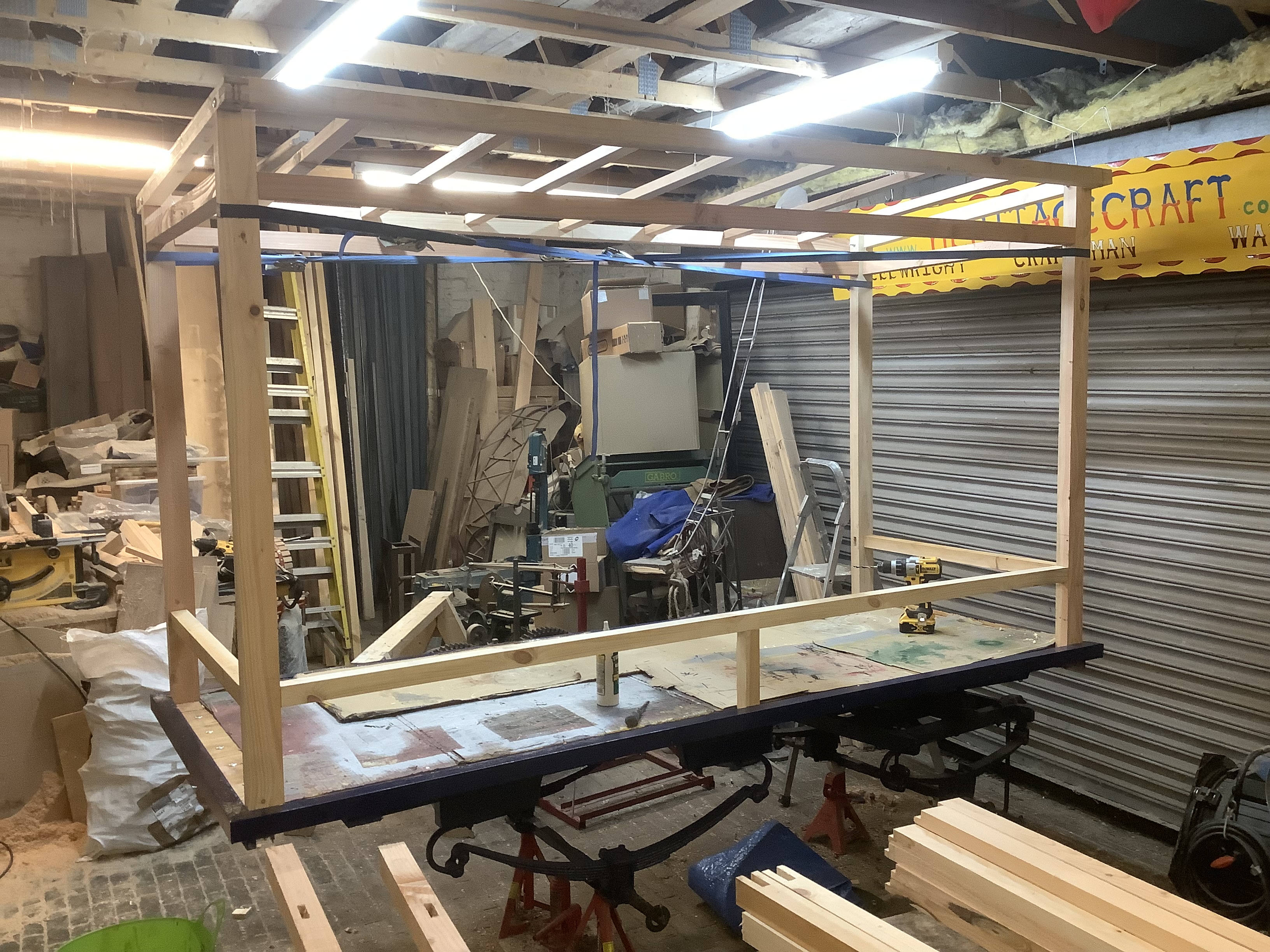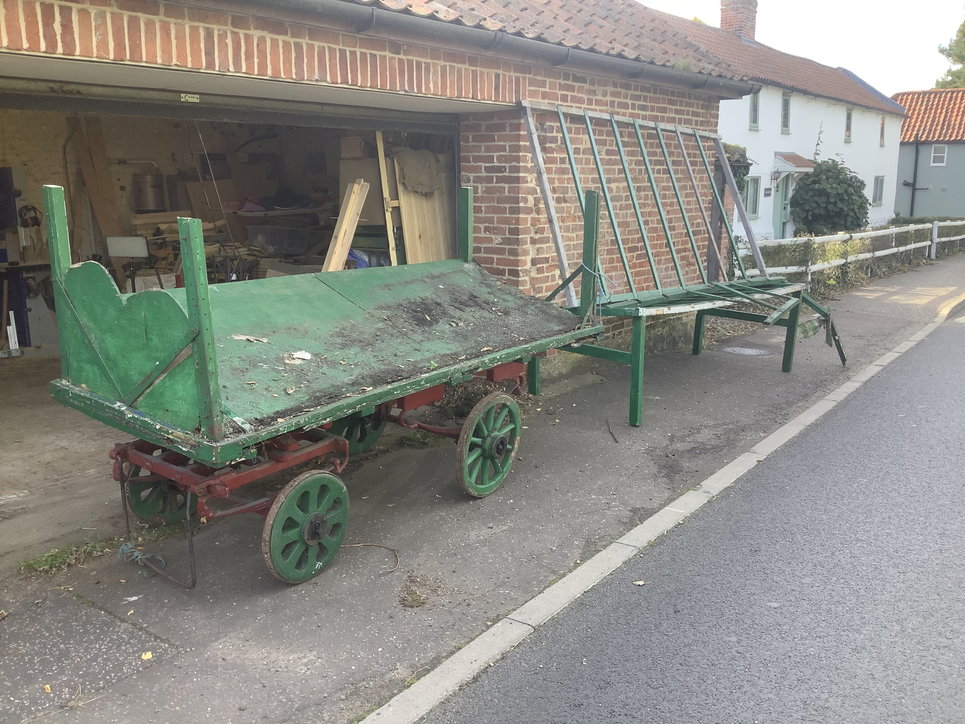 The cart arrived at my workshop in a selection of pieces. In order to minimise transport costs, the roof sections which were falling apart had been cut off. The sloping display was rotten, as it turned out was pretty much all of the superstructure.