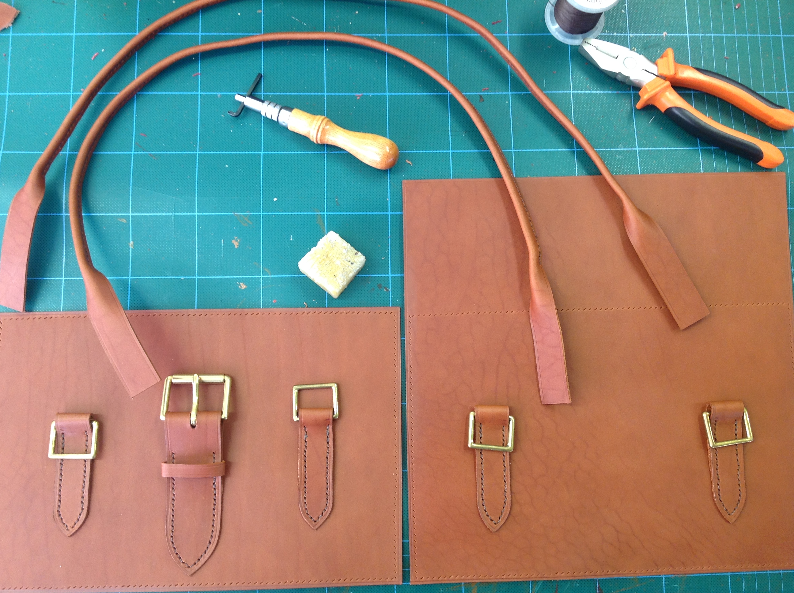 Luckily I am using slightly lighter weight leather than usual, its about 2mm thick as opposed to 3-4mm, as you can see I have made the front and the back, attached the square rings for the straps, and the buckle. I have also sewn the shoulder straps and sides. Now all I have to do is sew it all together and then sew in the lining with a zipped pocket.