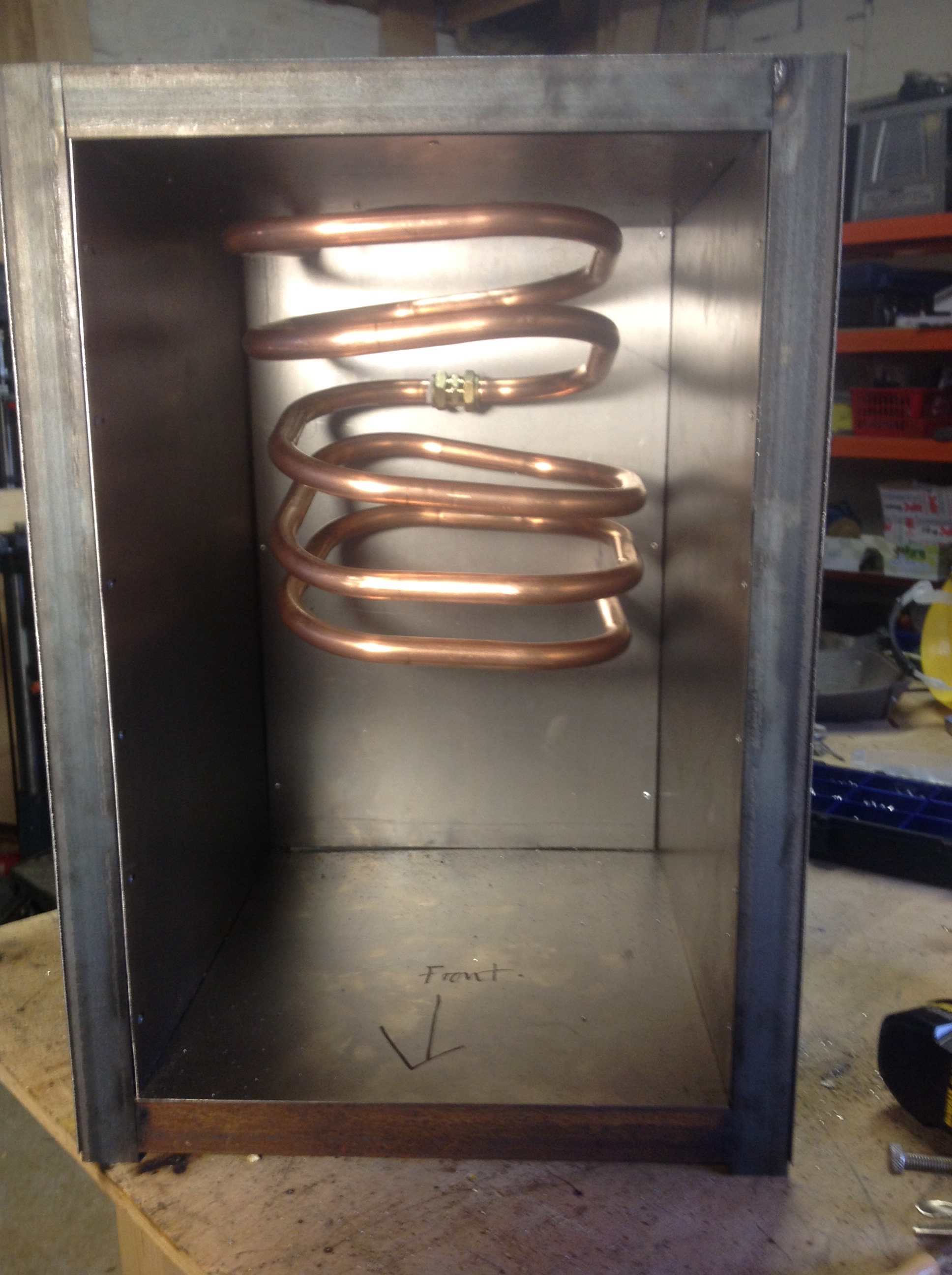 In many ways having too much time to think this through, over many sleepless nights and bored days, created a design with a number of refinements, which probably made it far more complicated than it needs to be. In essence it’s a double skinned steel box, with a copper pipe bent into a coil. You light a fire inside and the fire heats up the water in the copper pipe, which exits into the hot tub, making use of what my academic daughters refer to as a temperature gradient, or as I know it “heat rises”.